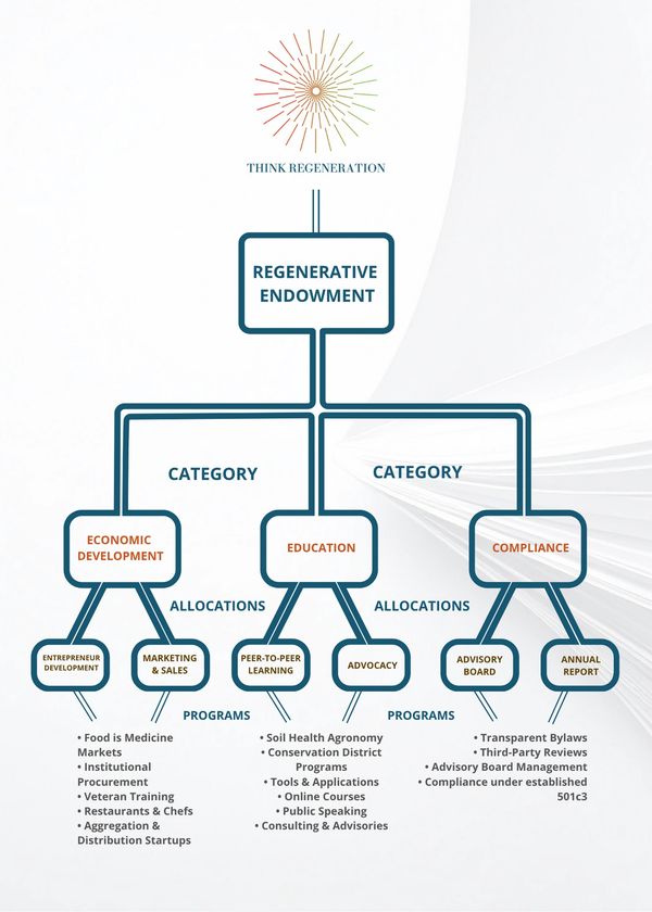 THE REGENERATIVE ENDOWMENT is a philanthropic fund started in 2025 and managed by Think Regeneration, a national nonprofit leader in the regenerative movement. With your support, we can create a food supply that delivers outcomes like human health, rural economic resilience, and entrepreneurial development to millions of Americans. To start, we have raised more than $50,000. If this mission speaks to you, please consider supporting our endowment that will directly contribute to our ability to build systems that nourish us all. It's possible, and the time is now.